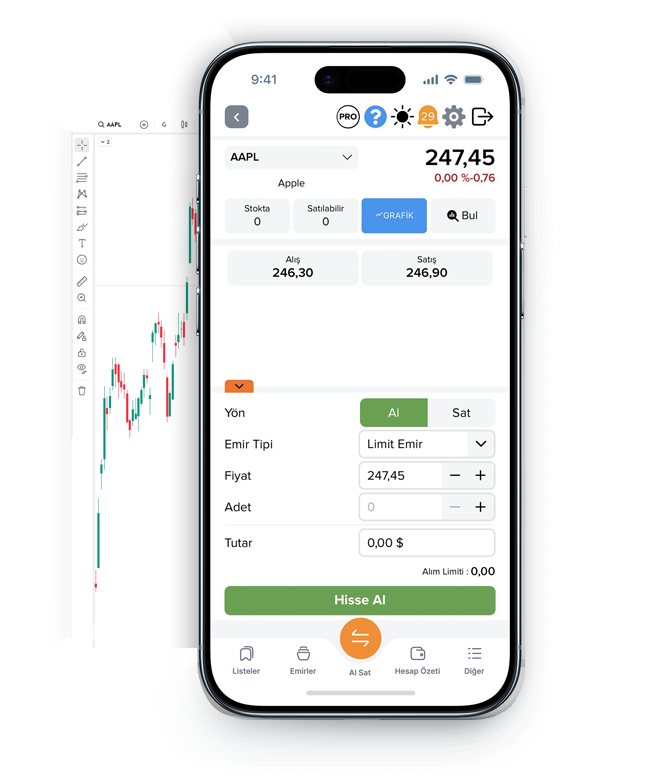 Hisse, VIOP, döviz ve ABD hisselerinde anlık alım‑satım ve gelişmiş analiz araçları.